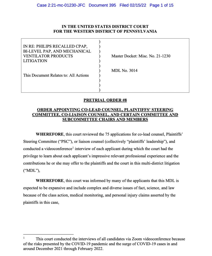 Audet & Partners, LLP has been named to the Steering Committee of the Philips CPAP Multidistrict Litigation centered in Philadelphia. Please click on the image below to view the Order appointing attorney William Audet to the litigation steering committee: